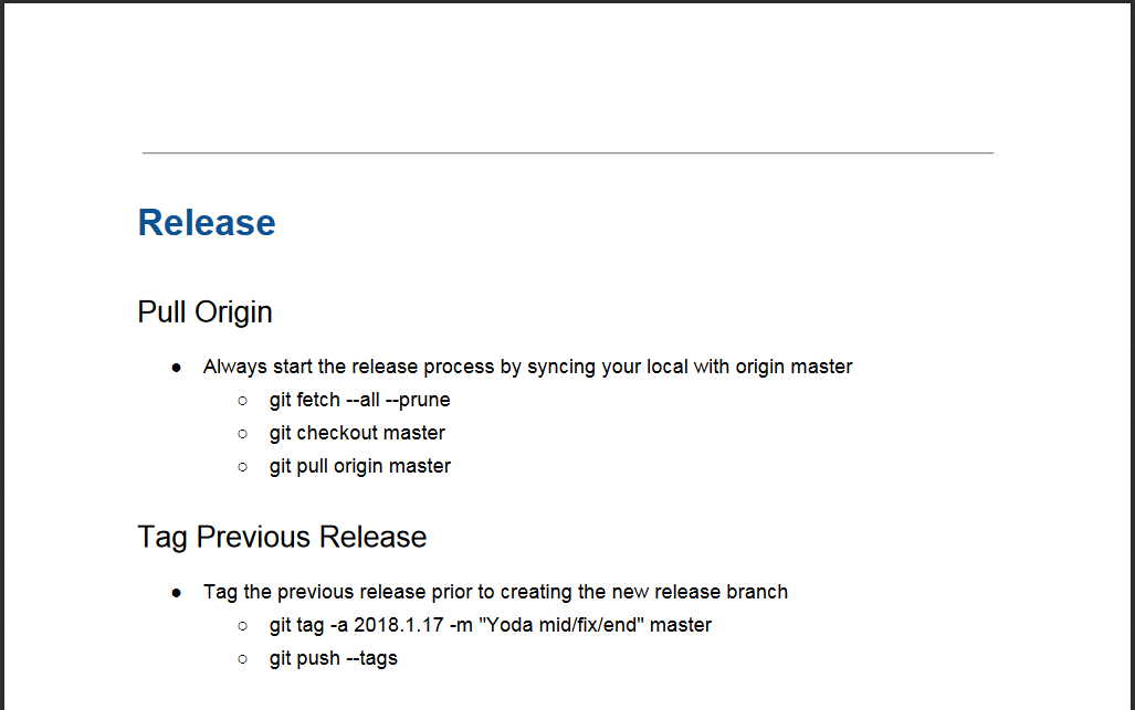 An important part of this work was documenting a coordinated release plan, which I wrote to include a detailed set of Git commands, so that any assigned individual from the team could handle the deployment of each release.