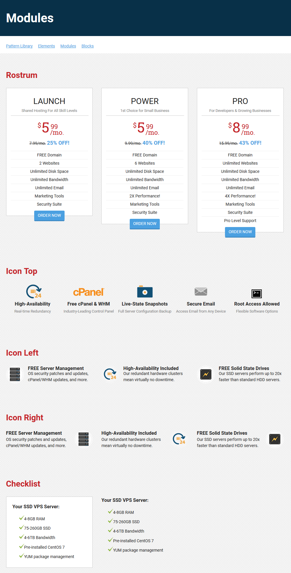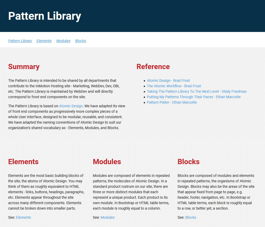 A Pattern Library serves many purposes. As a centrally located visual reference for all front end components, it promotes consistency and efficiency in updates to the site.