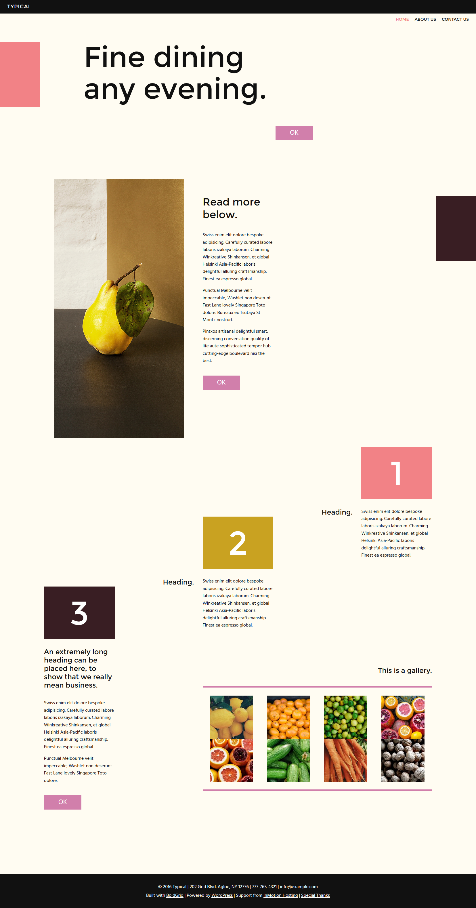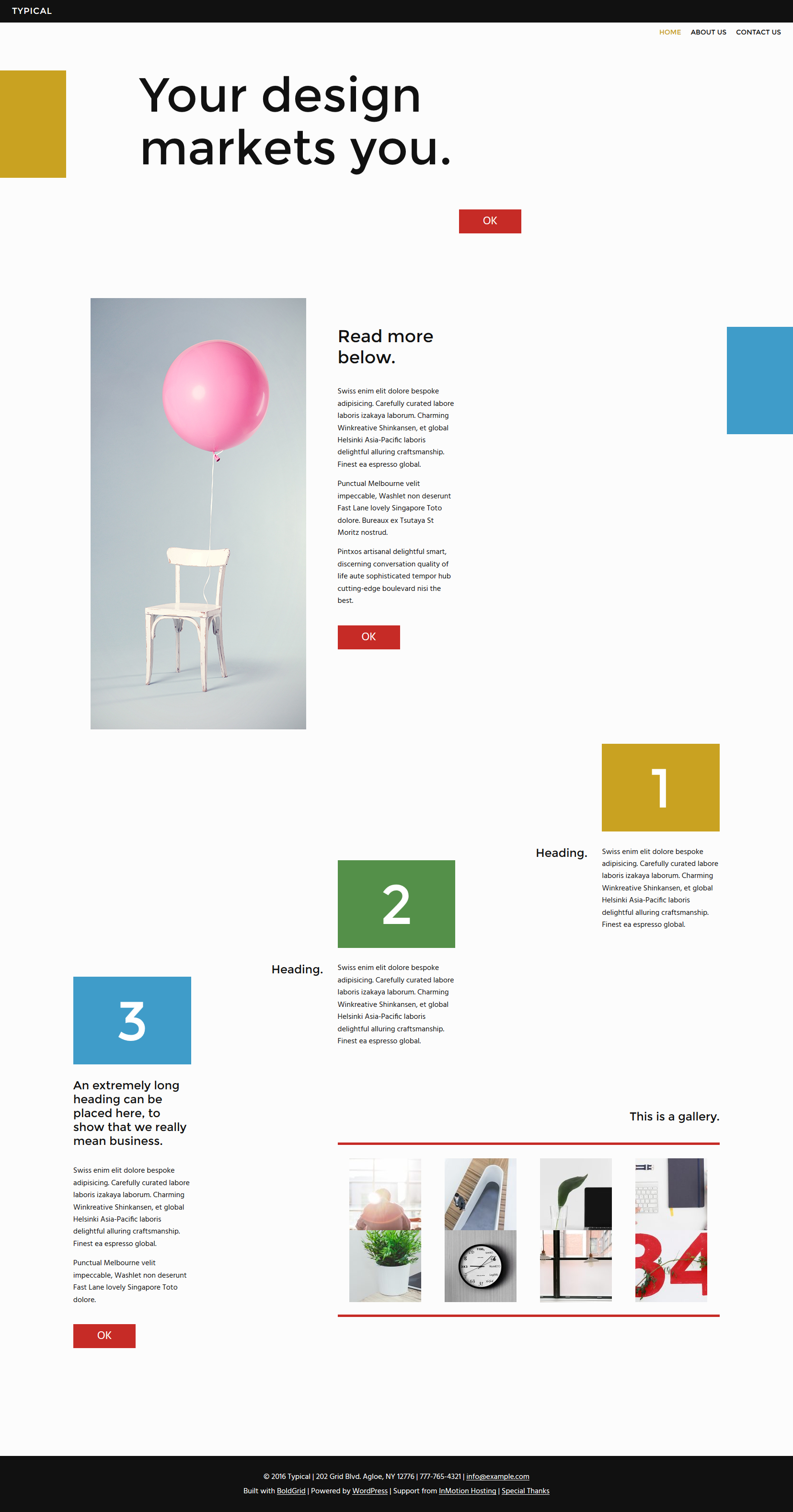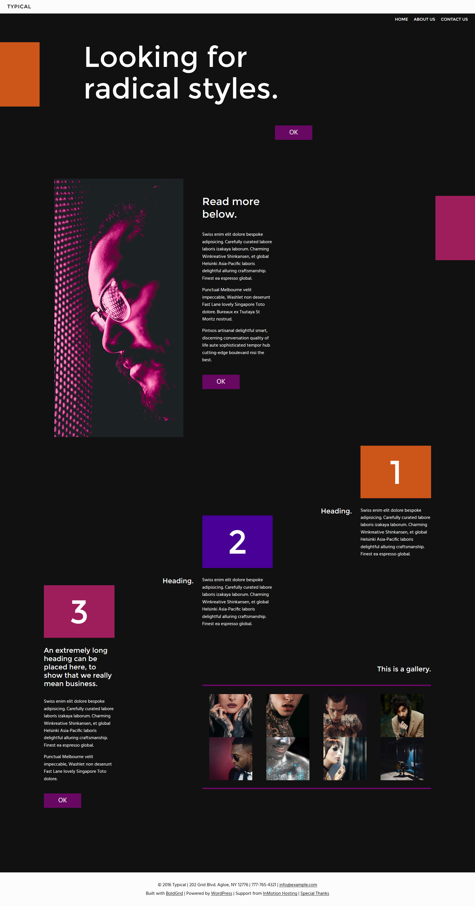 Designing a theme for a web builder is an interesting challenge, ideally demonstrating strong, clean design without being overly opinionated. I was inspired by the Swiss Style for the above.